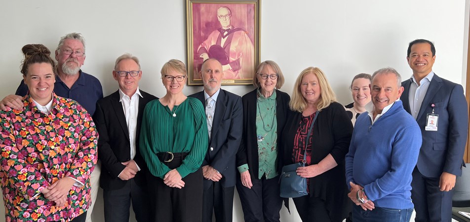 Pictured (L-R): Laura Meese, John Meese, Prof Peter Mount (SWIFT Clinical Lead, Victoria), Prof Rachael Morton (SWIFT PI), Dr Phil Ronaldson, Dr Sue Ronaldson, Annette Marcon, Danielle Marcon, Adrian Marcon, Vincent Ramos (CEO Austin Foundation)